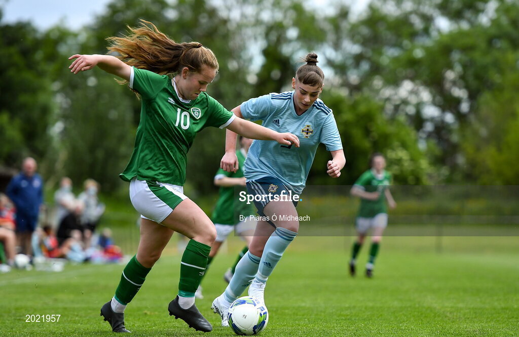 9 June 2021; Muireann Devaney of Republic of Ireland in action against Shona Davis of Northern Ireland during the Women's U19 International Friendly between Republic of Ireland and Northern Ireland at AUL Complex in Dublin. Photo by Piaras Ó Mídheach/Sportsfile