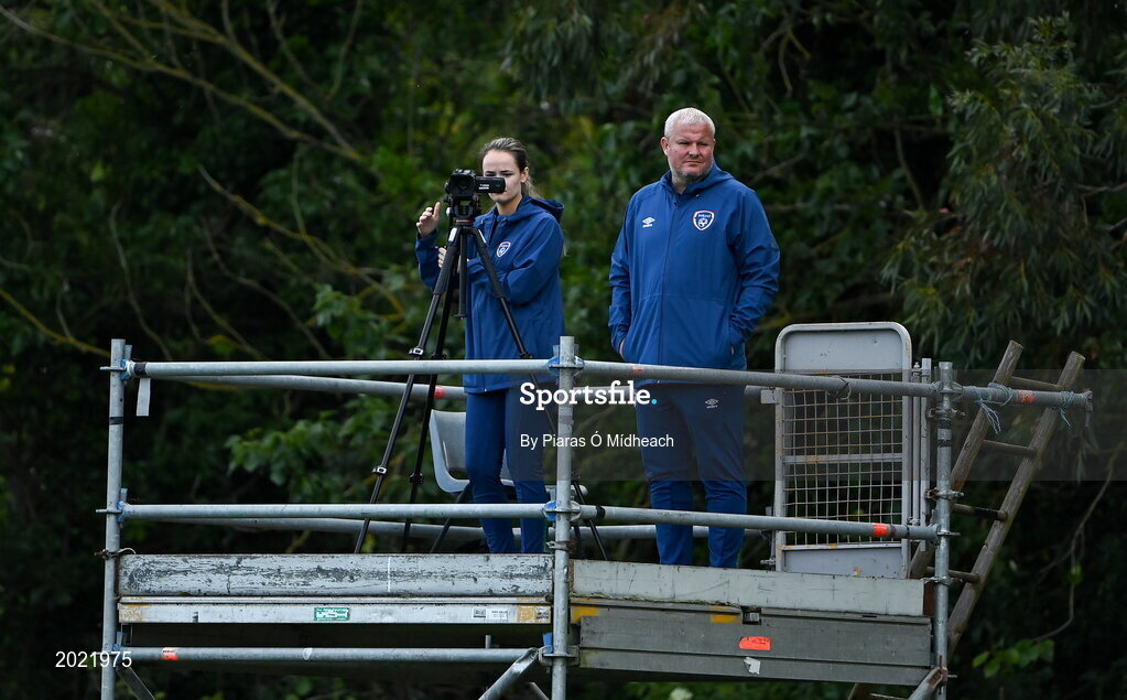 9 June 2021; Republic of Ireland assistant coach Keith O'Halloran and video analyst Kara Huxley during the Women's U19 International Friendly between Republic of Ireland and Northern Ireland at AUL Complex in Dublin. Photo by Piaras Ó Mídheach/Sportsfile