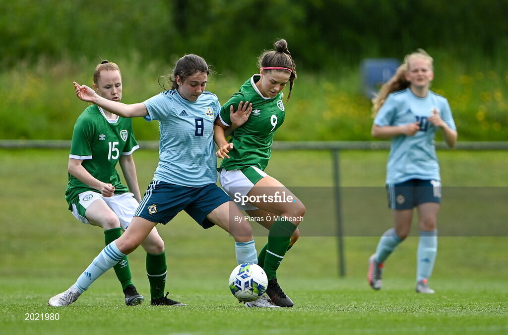 9 June 2021; Rhyleigh Marks of Northern Ireland in action against Rebecca Watkins of Republic of Ireland during the Women's U19 International Friendly between Republic of Ireland and Northern Ireland at AUL Complex in Dublin. Photo by Piaras Ó Mídheach/Sportsfile