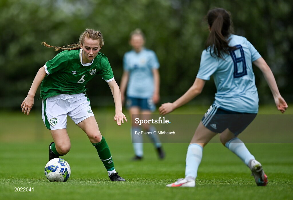 9 June 2021; Aoibheann Clancy of Republic of Ireland in action against Rhyleigh Marks of Northern Ireland during the Women's U19 International Friendly between Republic of Ireland and Northern Ireland at AUL Complex in Dublin. Photo by Piaras Ó Mídheach/Sportsfile