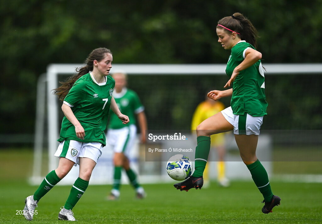 9 June 2021; Rebecca Watkins, right, and Aoife Horgan of Republic of Ireland during the Women's U19 International Friendly between Republic of Ireland and Northern Ireland at AUL Complex in Dublin. Photo by Piaras Ó Mídheach/Sportsfile