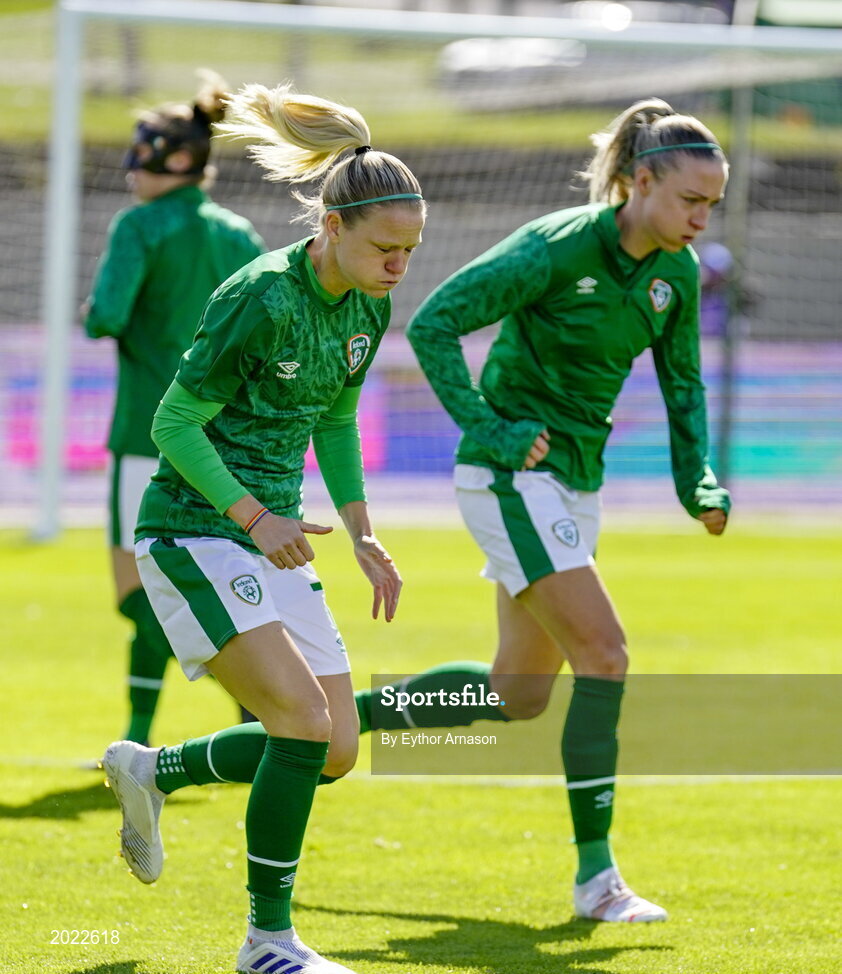 11 June 2021; Diane Caldwell and Louise Quinn of Ireland warm up before the international friendly match between Iceland and Republic of Ireland at Laugardalsvollur in Reykjavik, Iceland. Photo by Eythor Arnason/Sportsfile