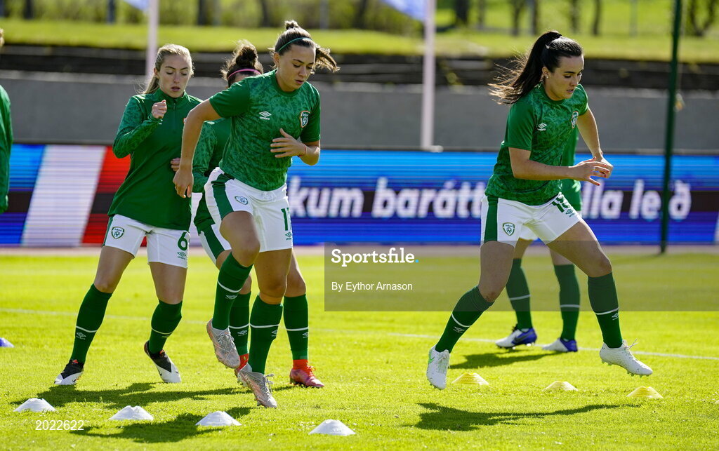 11 June 2021; Katie McCabe and Niamh Farrelly of Ireland warm up before the international friendly match between Iceland and Republic of Ireland at Laugardalsvollur in Reykjavik, Iceland. Photo by Eythor Arnason/Sportsfile