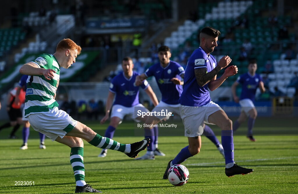 11 June 2021; Rory Gaffney of Shamrock Rovers in action against Adam Foley of Finn Harps during the SSE Airtricity League Premier Division match between Shamrock Rovers and Finn Harps at Tallaght Stadium in Dublin. The game is one of the first of a number of pilot sports events over the coming weeks which are implementing guidelines set out by the Irish government to allow for the safe return of spectators to sporting events. Photo by Stephen McCarthy/Sportsfile