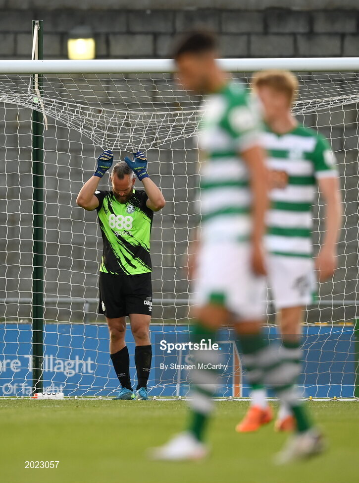 11 June 2021; Shamrock Rovers goalkeeper Alan Mannus reacts to conceding a goal during the SSE Airtricity League Premier Division match between Shamrock Rovers and Finn Harps at Tallaght Stadium in Dublin. The game is one of the first of a number of pilot sports events over the coming weeks which are implementing guidelines set out by the Irish government to allow for the safe return of spectators to sporting events. Photo by Stephen McCarthy/Sportsfile