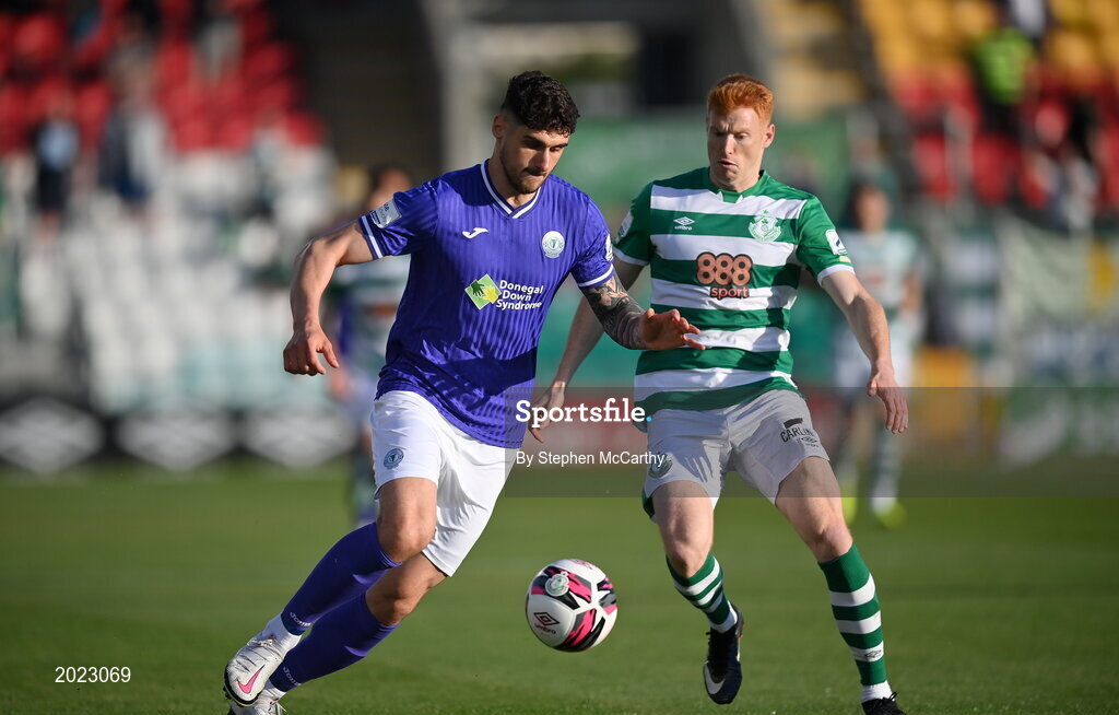 11 June 2021; Kosovar Sadiki of Finn Harps in action against Rory Gaffney of Shamrock Rovers during the SSE Airtricity League Premier Division match between Shamrock Rovers and Finn Harps at Tallaght Stadium in Dublin. The game is one of the first of a number of pilot sports events over the coming weeks which are implementing guidelines set out by the Irish government to allow for the safe return of spectators to sporting events. Photo by Stephen McCarthy/Sportsfile