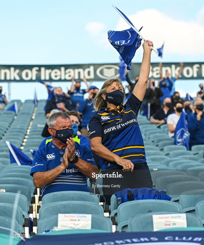 11 June 2021; Supporters sit in the stands during the Guinness PRO14 match between Leinster and Dragons at RDS Arena in Dublin. The game is one of the first of a number of pilot sports events over the coming weeks which are implementing guidelines set out by the Irish government to allow for the safe return of spectators to sporting events. Photo by Ramsey Cardy/Sportsfile