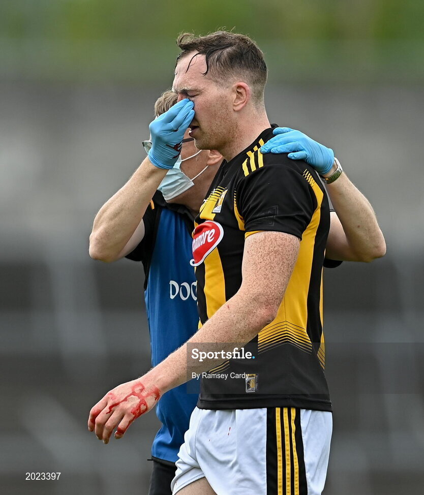 12 June 2021; Walter Walsh of Kilkenny leaves the pitch with a blood injury during the Allianz Hurling League Division 1 Group B Round 5 match between Clare and Kilkenny at Cusack Park in Ennis, Clare. Photo by Ramsey Cardy/Sportsfile