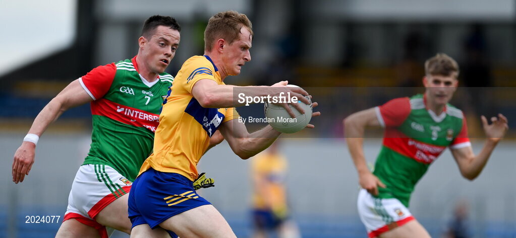 13 June 2021; Pearse Lillis of Clare in action against Stephen Coen, left, and Rory Brickenden of Mayo during the Allianz Football League Division 2 semi-final match between Clare and Mayo at Cusack Park in Ennis, Clare. Photo by Brendan Moran/Sportsfile