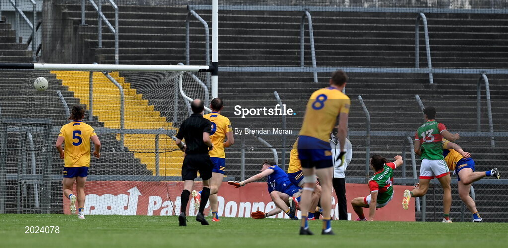 13 June 2021; Oisin Mullin of Mayo (3) scores his side's second goal during the Allianz Football League Division 2 semi-final match between Clare and Mayo at Cusack Park in Ennis, Clare. Photo by Brendan Moran/Sportsfile