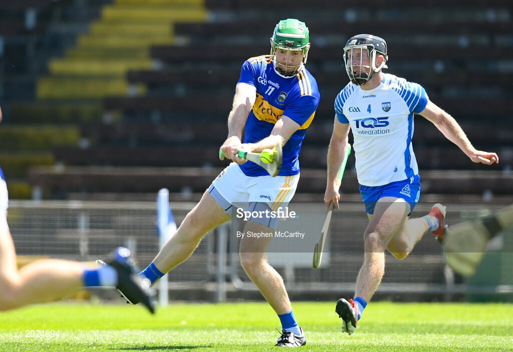 13 June 2021; Noel McGrath of Tipperary shoots to score his side's second goal despite the attention of Ian Kenny of Waterford during the Allianz Hurling League Division 1 Group A Round 5 match between Waterford and Tipperary at Walsh Park in Waterford. Photo by Stephen McCarthy/Sportsfile