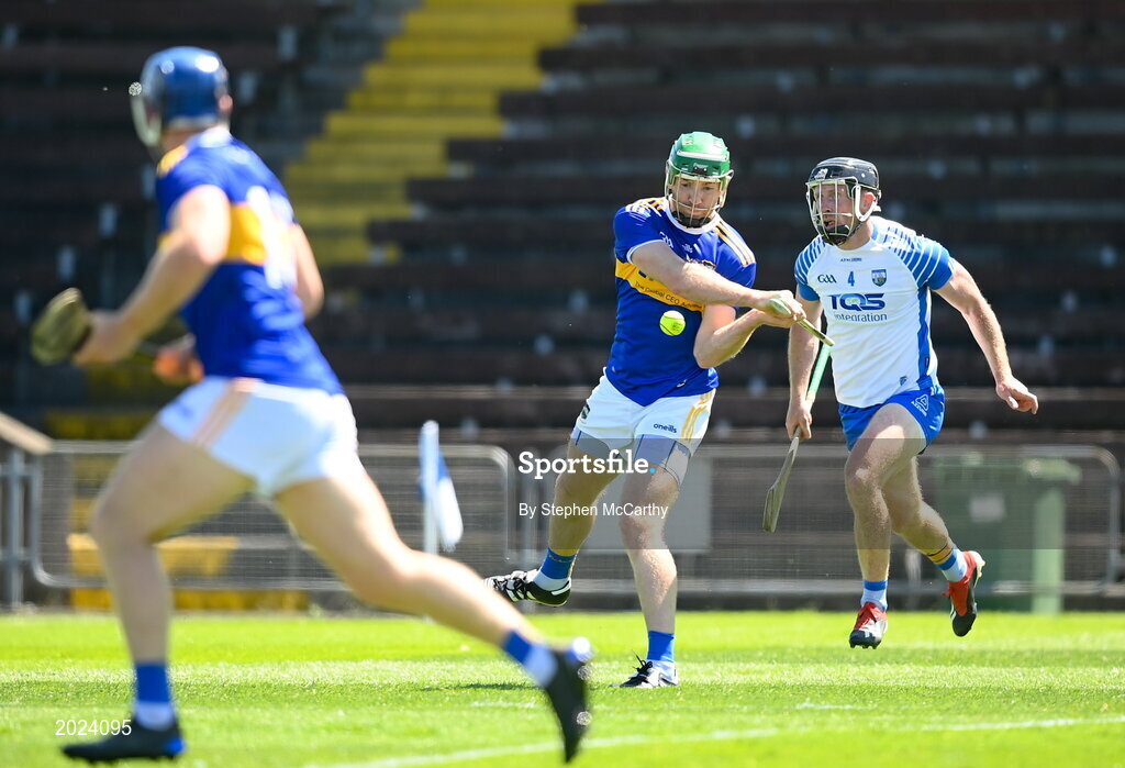 13 June 2021; Noel McGrath of Tipperary shoots to score his side's second goal despite the attention of Ian Kenny of Waterford during the Allianz Hurling League Division 1 Group A Round 5 match between Waterford and Tipperary at Walsh Park in Waterford. Photo by Stephen McCarthy/Sportsfile