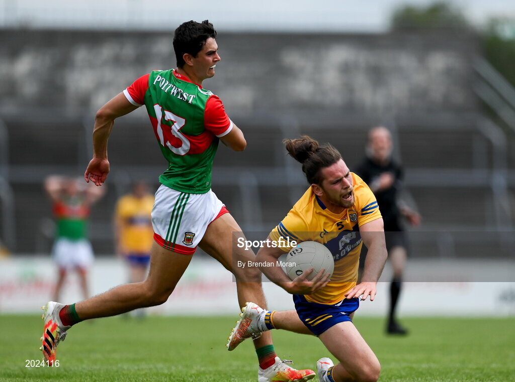 13 June 2021; Cian O'Dea of Clare in action against Tommy Conroy of Mayo during the Allianz Football League Division 2 semi-final match between Clare and Mayo at Cusack Park in Ennis, Clare. Photo by Brendan Moran/Sportsfile