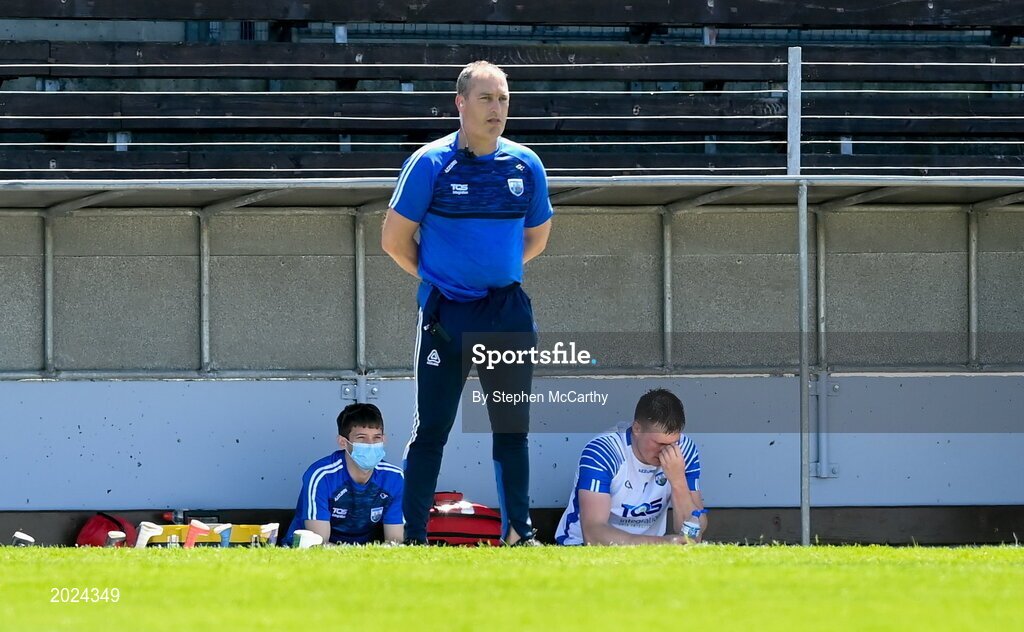 13 June 2021; Injured Waterford player Austin Gleeson and manager Liam Cahill during the Allianz Hurling League Division 1 Group A Round 5 match between Waterford and Tipperary at Walsh Park in Waterford. Photo by Stephen McCarthy/Sportsfile