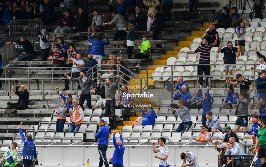 13 June 2021; Monaghan substitutes, official and supporters, including the suspended Monaghan manager Seamus McEnaney, react to a later Monaghan point to level the game in normal time during the Allianz Football League Division 1 Relegation play-off match between Monaghan and Galway at St. Tiernach’s Park in Clones, Monaghan. Photo by Ray McManus/Sportsfile
