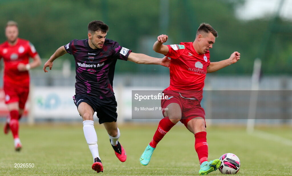18 June 2021; Dayle Rooney of Shelbourne in action against Karl Fitzsimons of Wexford during the SSE Airtricity League First Division match between Wexford and Shelbourne at Ferrycarrig Park in Wexford. Photo by Michael P Ryan/Sportsfile