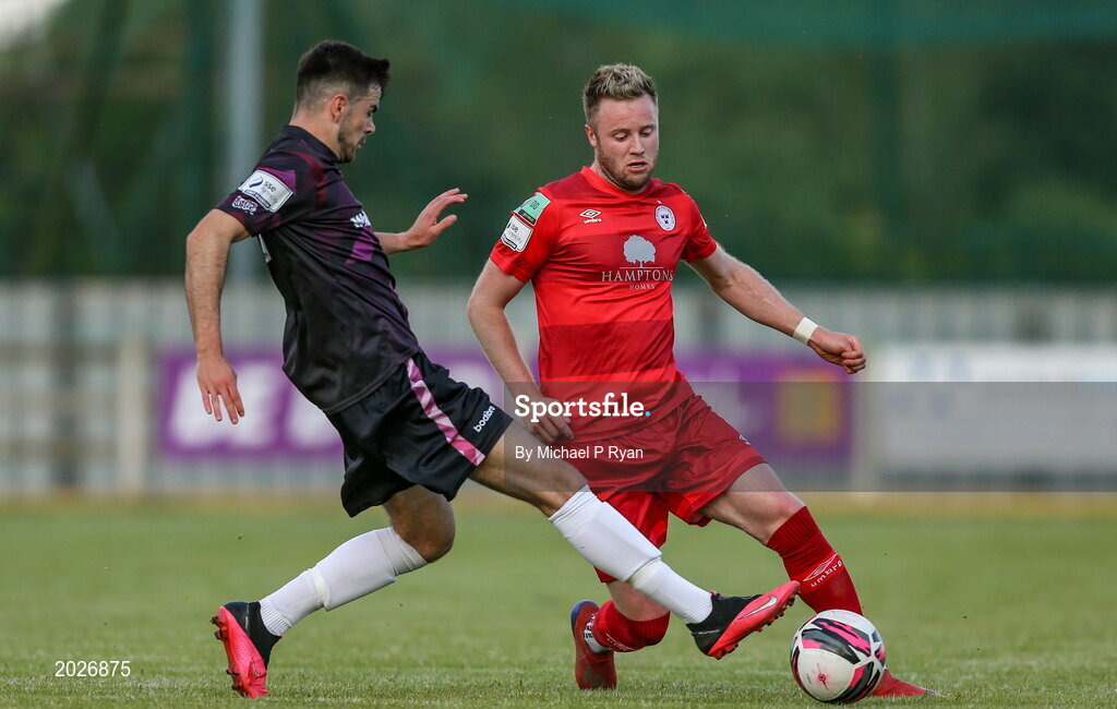 18 June 2021; Kevin O'Connor of Shelbourne in action against Karl Fitzsimons of Wexford during the SSE Airtricity League First Division match between Wexford and Shelbourne at Ferrycarrig Park in Wexford. Photo by Michael P Ryan/Sportsfile