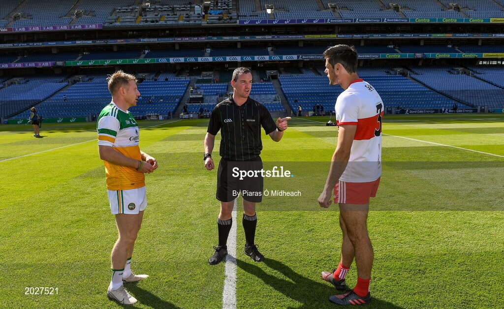 19 June 2021; Referee Seán Lonergan with team captains Niall Darby of Offaly and Christopher McKaigue of Derry before the Allianz Football League Division 3 Final match between Derry and Offaly at Croke Park in Dublin. Photo by Piaras Ó Mídheach/Sportsfile