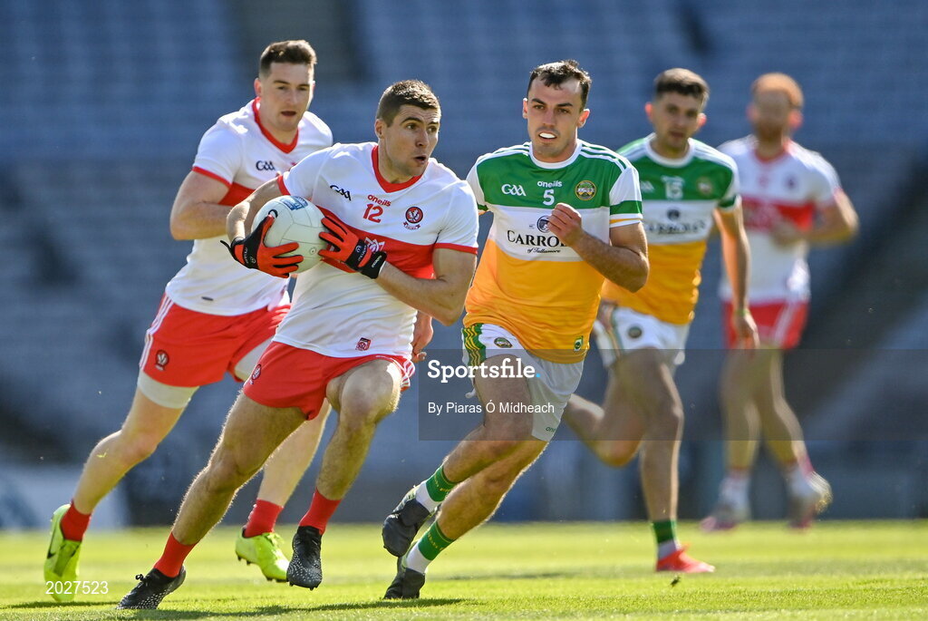 19 June 2021; Ciarán McFaul of Derry in action against Colm Doyle of Offaly during the Allianz Football League Division 3 Final match between Derry and Offaly at Croke Park in Dublin. Photo by Piaras Ó Mídheach/Sportsfile