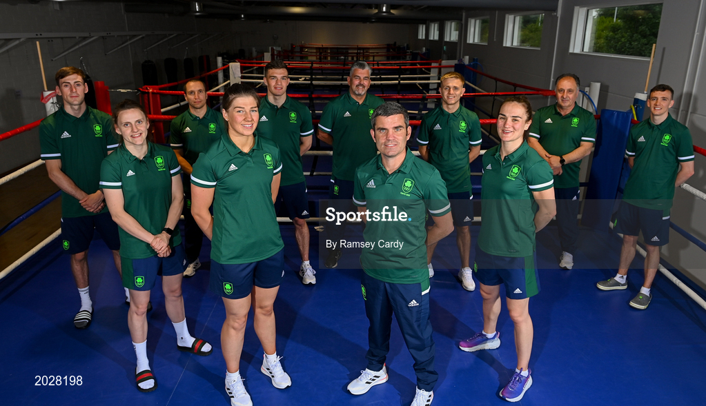 29 June 2021; High performance director Bernard Dunne, centre, with, from left to right, Aidan Walsh, Michaela Walsh, coach Dmitry Dmitruk, Aoife O'Rourke, Emmet Brennan, coach John Conlan, Kurt Walker, Kellie Harrington, coach Zaur Antia and Brendan Irvine during a Tokyo 2020 Team Ireland Announcement for Boxing in the Sport Ireland Institute at the Sport Ireland Campus in Dublin. Photo by Ramsey Cardy/Sportsfile