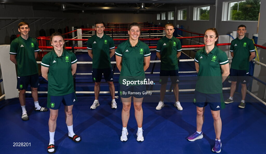 29 June 2021; Boxers, from left, Aidan Walsh, Michaela Walsh, Emmet Brennan, Aoife O'Rourke, Kurt Walker, Kellie Harrington and Brendan Irvine during a Tokyo 2020 Team Ireland Announcement for Boxing in the Sport Ireland Institute at the Sport Ireland Campus in Dublin. Photo by Ramsey Cardy/Sportsfile