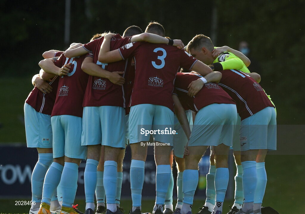 11 June 2021; Cobh Ramblers players huddle before the SSE Airtricity League First Division match between UCD and Cobh Ramblers at UCD Bowl in Dublin. Photo by Matt Browne/Sportsfile