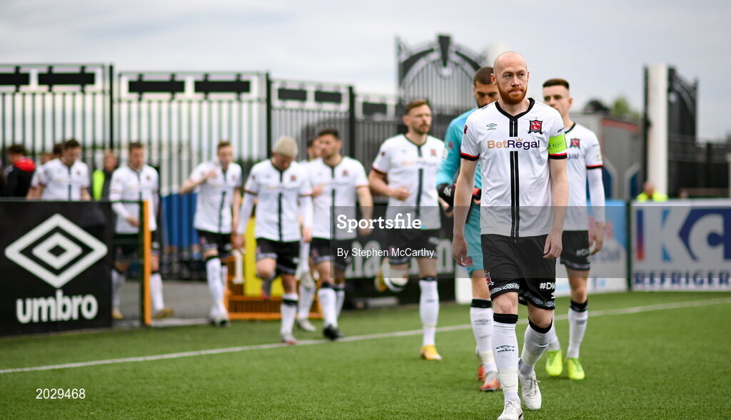 25 June 2021; Dundalk captain Chris Shields leads his side out ahead of playing his final game for the club before the SSE Airtricity League Premier Division match between Dundalk and Derry City at Oriel Park in Dundalk, Louth. Photo by Stephen McCarthy/Sportsfile