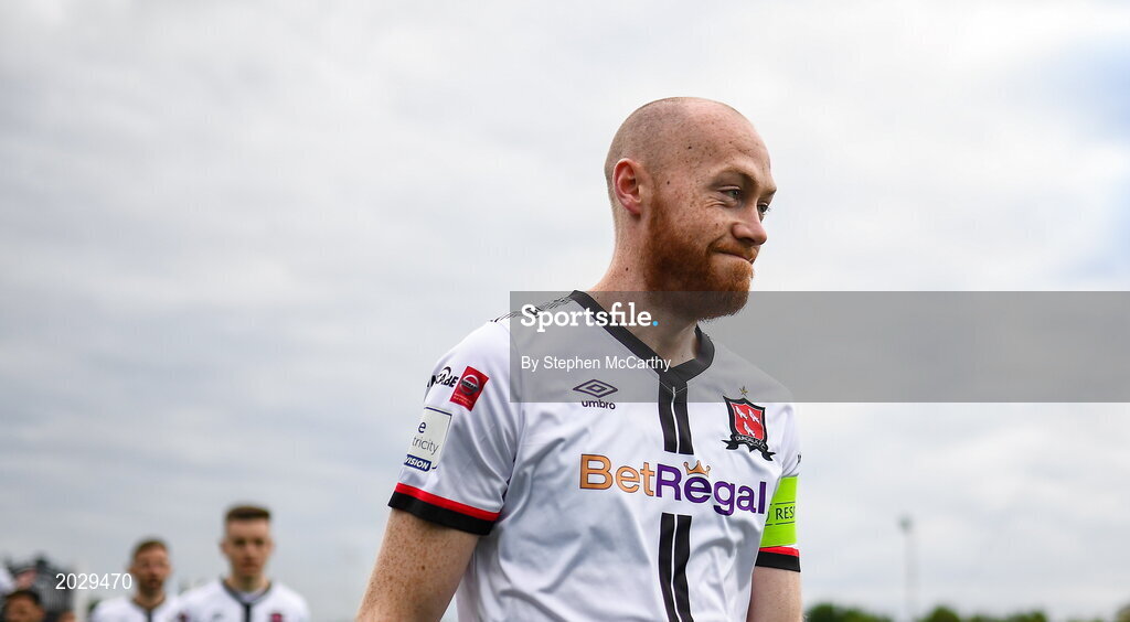 25 June 2021; Dundalk captain Chris Shields leads his side out ahead of playing his final game for the club before the SSE Airtricity League Premier Division match between Dundalk and Derry City at Oriel Park in Dundalk, Louth. Photo by Stephen McCarthy/Sportsfile
