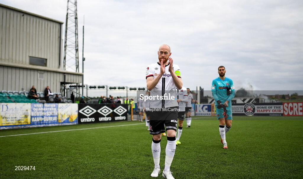25 June 2021; Dundalk captain Chris Shields leads his side out ahead of playing his final game for the club before the SSE Airtricity League Premier Division match between Dundalk and Derry City at Oriel Park in Dundalk, Louth. Photo by Stephen McCarthy/Sportsfile