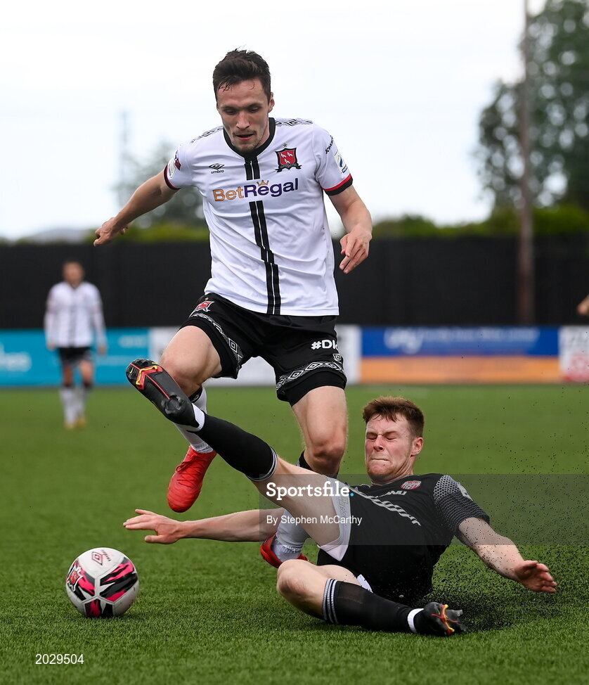 25 June 2021; Raivis Jurkovskis of Dundalk is tackled by Cameron McJannet of Derry City during the SSE Airtricity League Premier Division match between Dundalk and Derry City at Oriel Park in Dundalk, Louth. Photo by Stephen McCarthy/Sportsfile