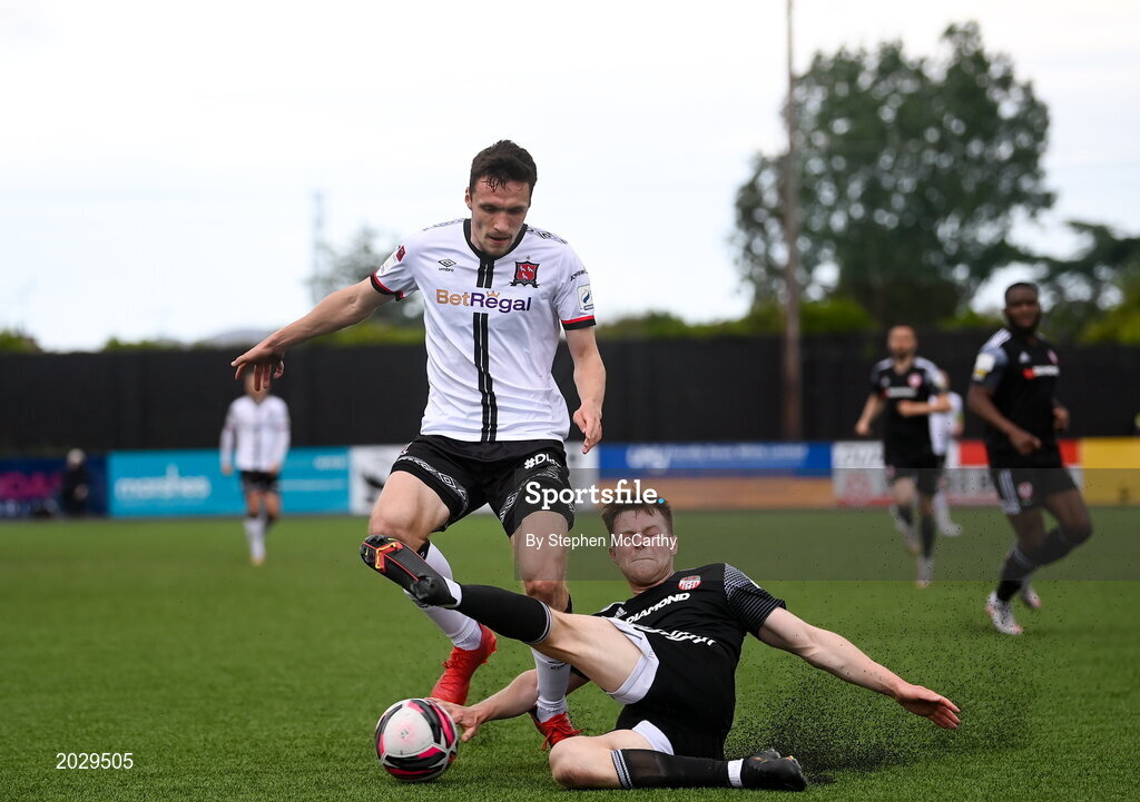 25 June 2021; Raivis Jurkovskis of Dundalk is tackled by Cameron McJannet of Derry City during the SSE Airtricity League Premier Division match between Dundalk and Derry City at Oriel Park in Dundalk, Louth. Photo by Stephen McCarthy/Sportsfile