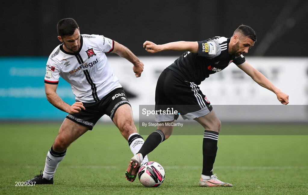 25 June 2021; Daniel Lafferty of Derry City in action against Patrick Hoban of Dundalk during the SSE Airtricity League Premier Division match between Dundalk and Derry City at Oriel Park in Dundalk, Louth. Photo by Stephen McCarthy/Sportsfile