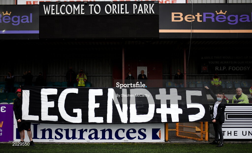 25 June 2021; Dundalk supporters display a banner for Chris Shields, who was playing his final game for the club, before the SSE Airtricity League Premier Division match between Dundalk and Derry City at Oriel Park in Dundalk, Louth. Photo by Stephen McCarthy/Sportsfile