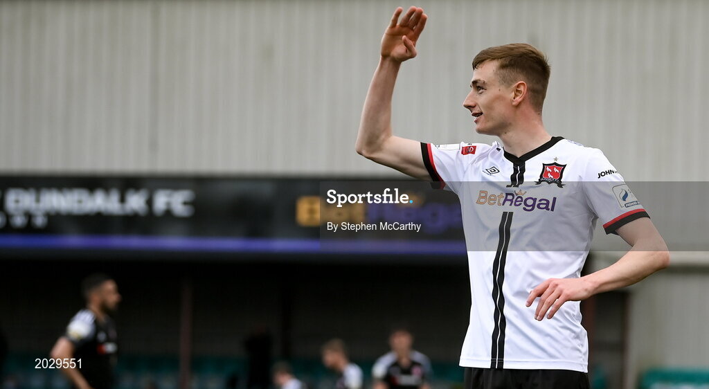 25 June 2021; Daniel Kelly of Dundalk celebrates after scoring his side's first goal during the SSE Airtricity League Premier Division match between Dundalk and Derry City at Oriel Park in Dundalk, Louth. Photo by Stephen McCarthy/Sportsfile