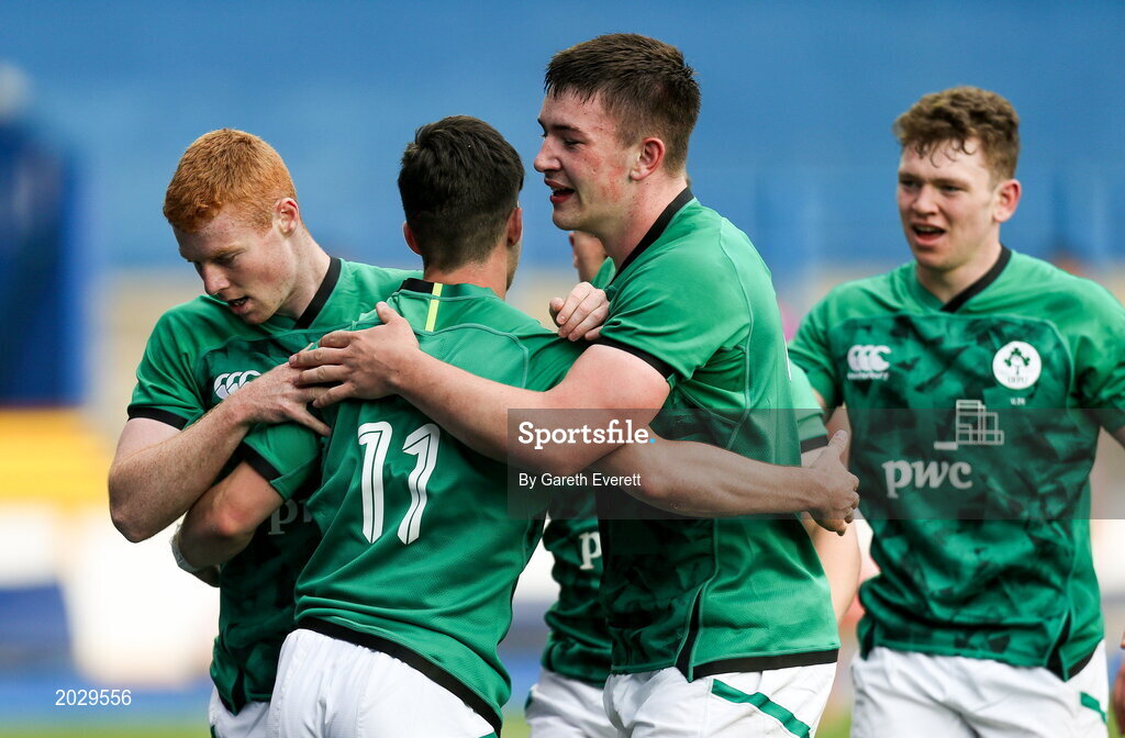 25 June 2021; Chris Cosgrave of Ireland is congratulated by team mates after he scores his sides second try during the U20 Six Nations Rugby Championship match between Wales and Ireland at Cardiff Arms Park in Cardiff, Wales. Photo by Gareth Everett/Sportsfile