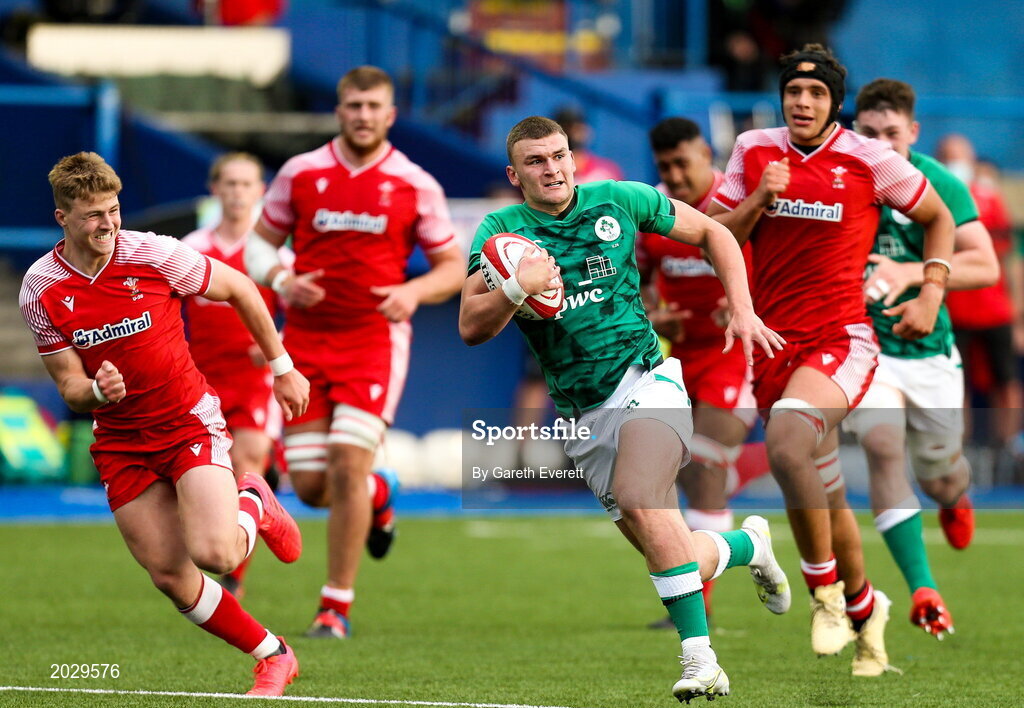 25 June 2021; Ben Moxham of Ireland makes a break during the U20 Six Nations Rugby Championship match between Wales and Ireland at Cardiff Arms Park in Cardiff, Wales. Photo by Gareth Everett/Sportsfile