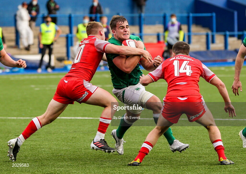 25 June 2021; Alex Kendellen of Ireland is tackled by Sam Costelow and Dan John of Wales during the U20 Six Nations Rugby Championship match between Wales and Ireland at Cardiff Arms Park in Cardiff, Wales. Photo by Gareth Everett/Sportsfile