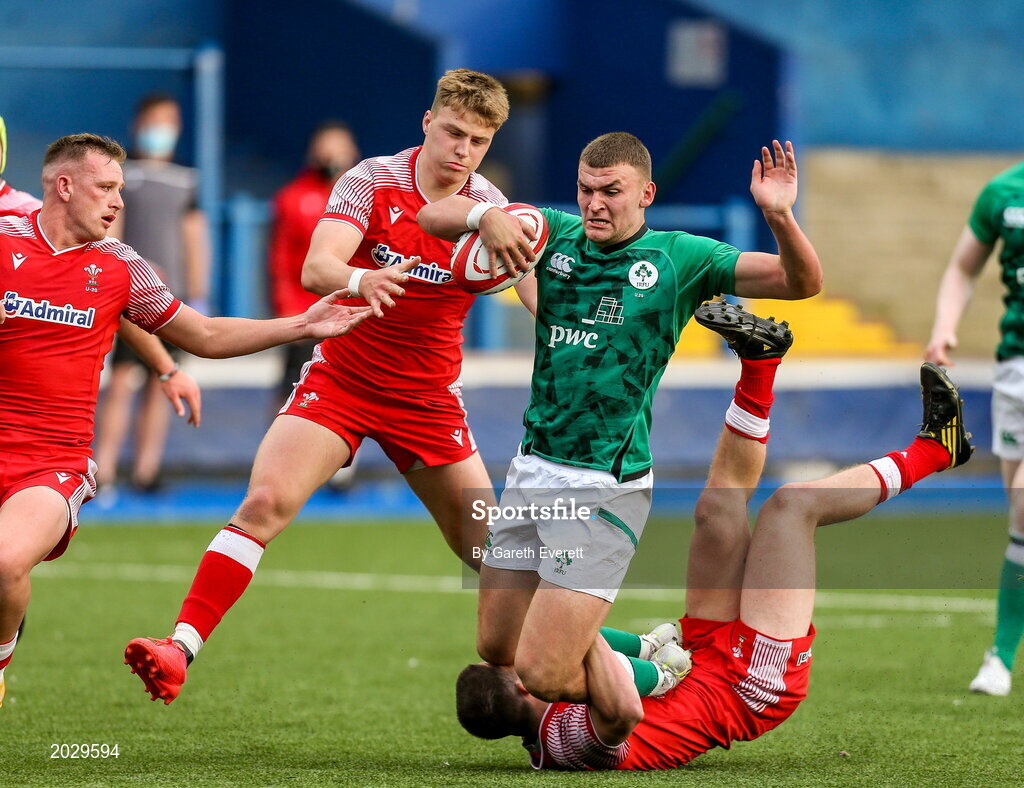 25 June 2021; Ben Moxham of Ireland is tackled by Dan John of Wales during the U20 Six Nations Rugby Championship match between Wales and Ireland at Cardiff Arms Park in Cardiff, Wales. Photo by Gareth Everett/Sportsfile