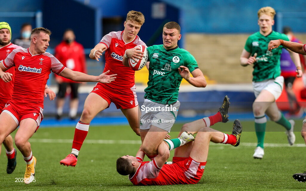 25 June 2021; Ben Moxham of Ireland is tackled by Dan John of Wales during the U20 Six Nations Rugby Championship match between Wales and Ireland at Cardiff Arms Park in Cardiff, Wales. Photo by Gareth Everett/Sportsfile