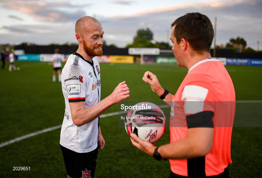 25 June 2021; Chris Shields of Dundalk having played his final game for the club, with referee Rob Harvey, after the SSE Airtricity League Premier Division match between Dundalk and Derry City at Oriel Park in Dundalk, Louth. Photo by Stephen McCarthy/Sportsfile