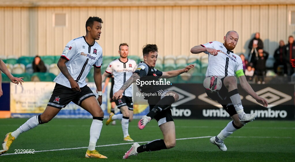 25 June 2021; Chris Shields of Dundalk defends a shot from Patrick Ferry of Derry City during the SSE Airtricity League Premier Division match between Dundalk and Derry City at Oriel Park in Dundalk, Louth. Photo by Stephen McCarthy/Sportsfile