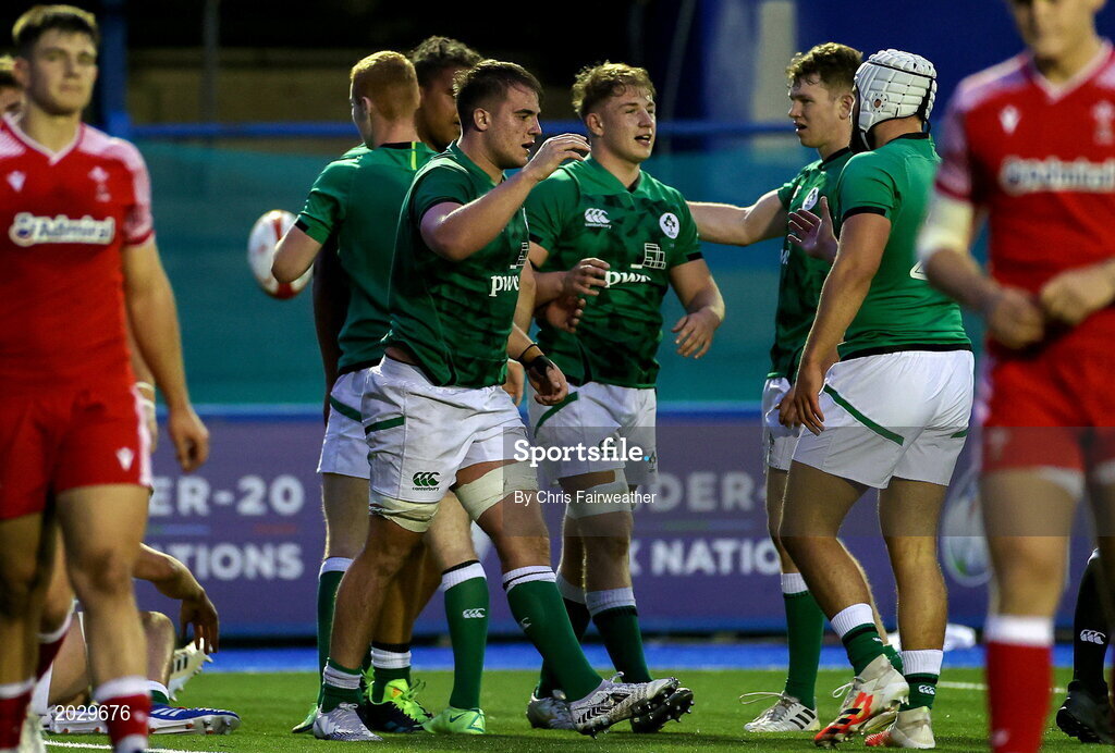 25 June 2021; Alex Kendellen of Ireland celebrates with his team-mates after scoring a try during the U20 Six Nations Rugby Championship match between Wales and Ireland at Cardiff Arms Park in Cardiff, Wales. Photo by Chris Fairweather/Sportsfile