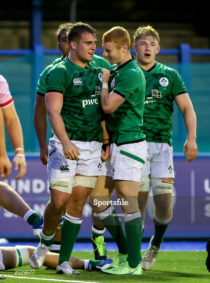 25 June 2021; Alex Kendellen of Ireland celebrates with his team-mates after scoring a try during the U20 Six Nations Rugby Championship match between Wales and Ireland at Cardiff Arms Park in Cardiff, Wales. Photo by Chris Fairweather/Sportsfile