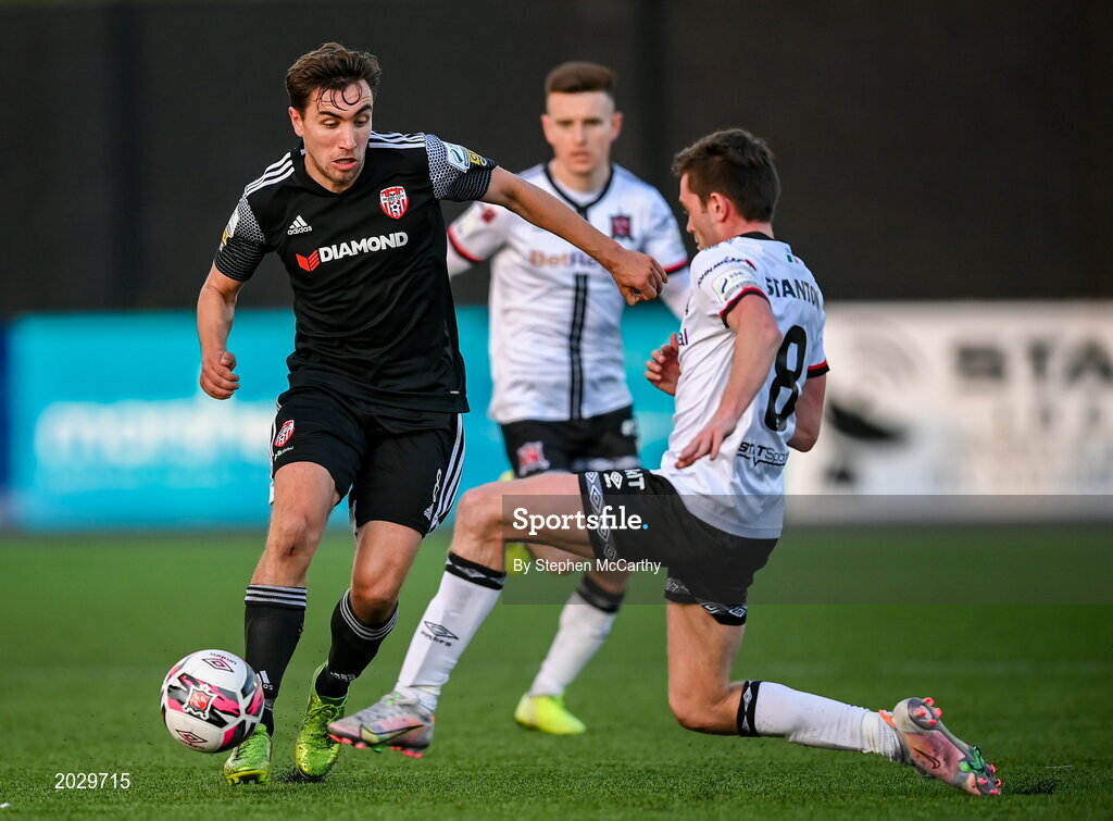 25 June 2021; Joe Thomson of Derry City in action against Sam Stanton of Dundalk during the SSE Airtricity League Premier Division match between Dundalk and Derry City at Oriel Park in Dundalk, Louth. Photo by Stephen McCarthy/Sportsfile