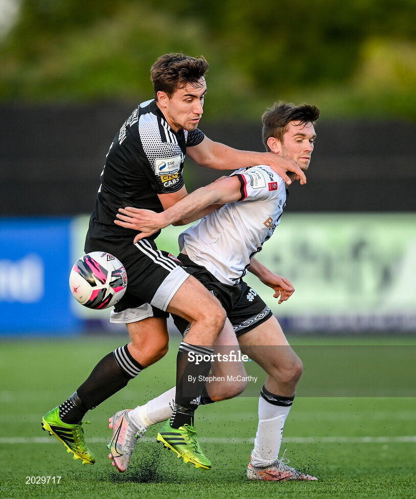 25 June 2021; Joe Thomson of Derry City in action against Sam Stanton of Dundalk during the SSE Airtricity League Premier Division match between Dundalk and Derry City at Oriel Park in Dundalk, Louth. Photo by Stephen McCarthy/Sportsfile