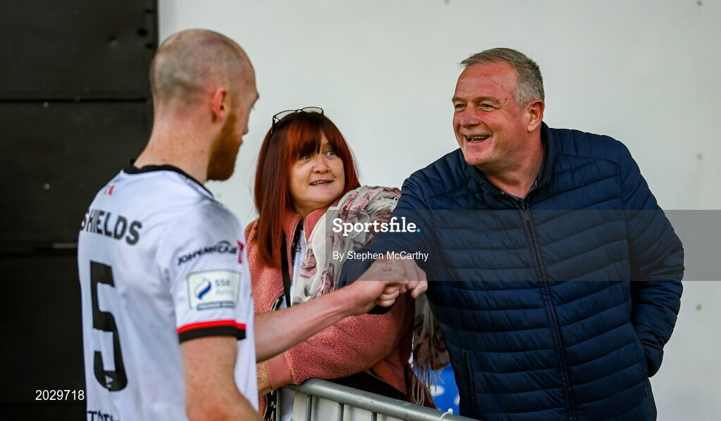 25 June 2021; A Dundalk supporter congratulates Chris Shields of Dundalk having played his final game for the club after the SSE Airtricity League Premier Division match between Dundalk and Derry City at Oriel Park in Dundalk, Louth. Photo by Stephen McCarthy/Sportsfile