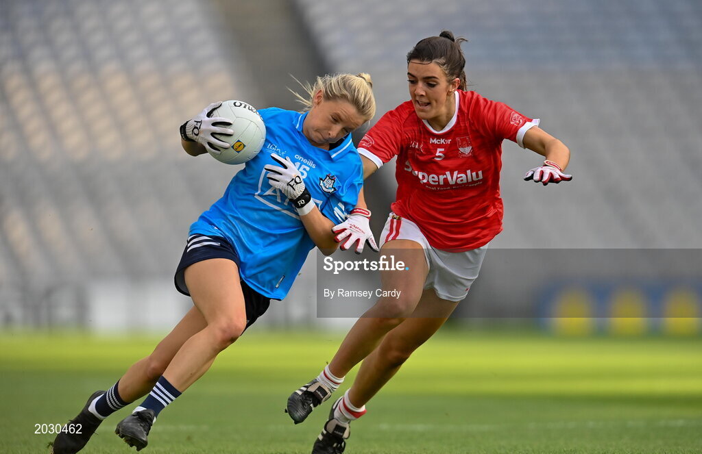 26 June 2021; Caoimhe O'Connor of Dublin in action against Erika O'Shea of Cork during the Lidl Ladies Football National League Division 1 Final match between Cork and Dublin at Croke Park in Dublin. Photo by Ramsey Cardy/Sportsfile