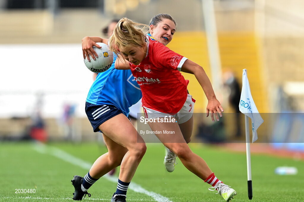 26 June 2021; Sadhbh O'Leary of Cork is tackled by Martha Byrne of Dublin during the Lidl Ladies Football National League Division 1 Final match between Cork and Dublin at Croke Park in Dublin. Photo by Brendan Moran/Sportsfile