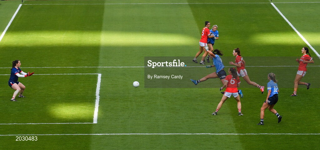 26 June 2021; Niamh Hetherton of Dublin shoots to score her side's first goal during the Lidl Ladies Football National League Division 1 Final match between Cork and Dublin at Croke Park in Dublin. Photo by Ramsey Cardy/Sportsfile