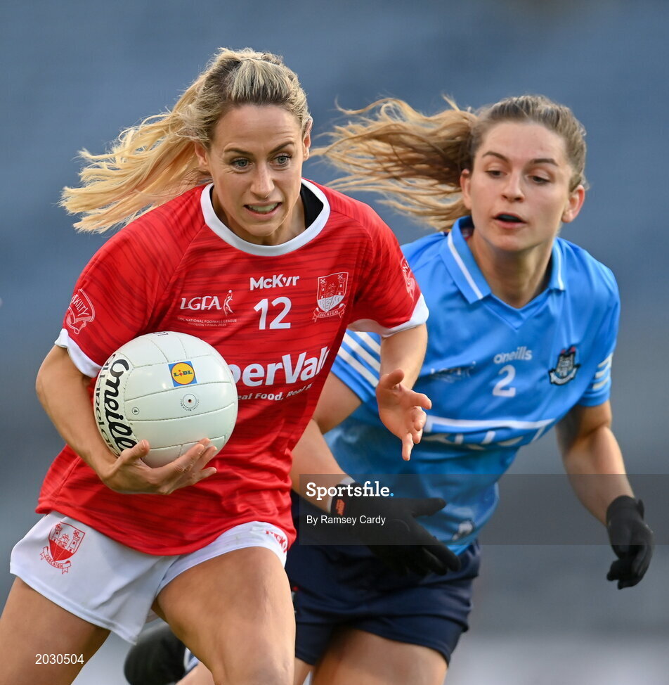 26 June 2021; Orla Finn of Cork in action against Martha Byrne of Dublin during the Lidl Ladies Football National League Division 1 Final match between Cork and Dublin at Croke Park in Dublin. Photo by Ramsey Cardy/Sportsfile